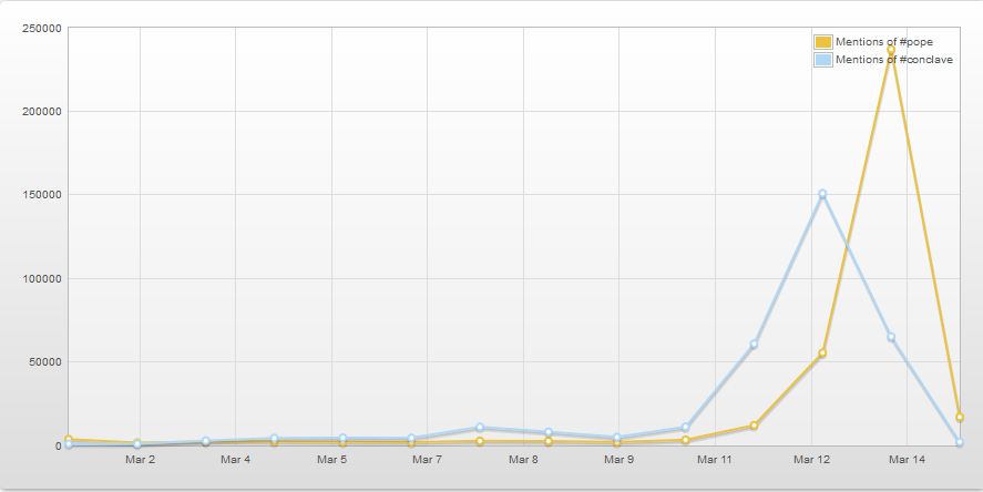 The hashtags#pope and #conclave were mentioned respectively 233787 and 153695 times on Twitter on 13th March 2013.