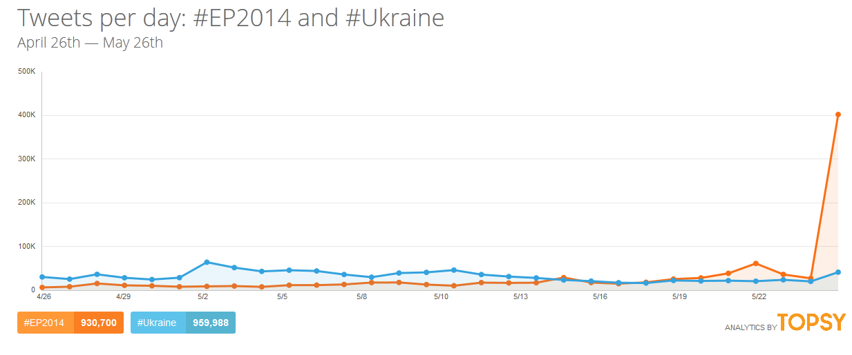 In order to provide some context, in the past 30 days we could record roughly the same amount of mentions for #EP2014 and #Ukraine.